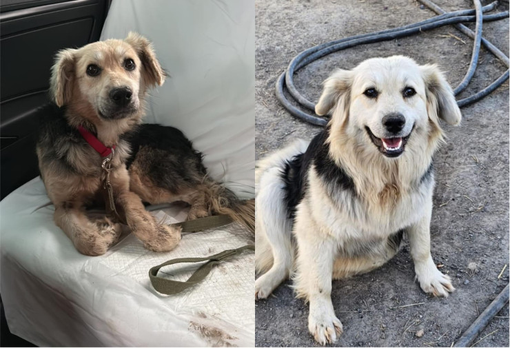На фото слева - то, какой она была, когда только попала в руки волонтеров. Она переболела чумкой, вдобавок ветврачи поставили ей сразу два диагноза: рахит и демодекоз (заболевание кожи, вызванное клещом). Справа же - то, какой Альма стала сейчас. Кажется, что она начала улыбаться.
