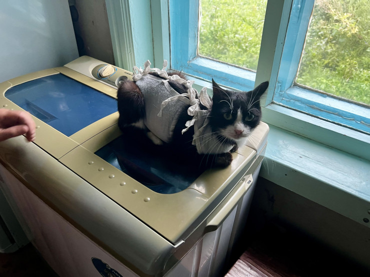 На стиральной машине сидит кошка в тканевой попоне. Татьяна Николаевна рассказывает, что она после стерилизации.