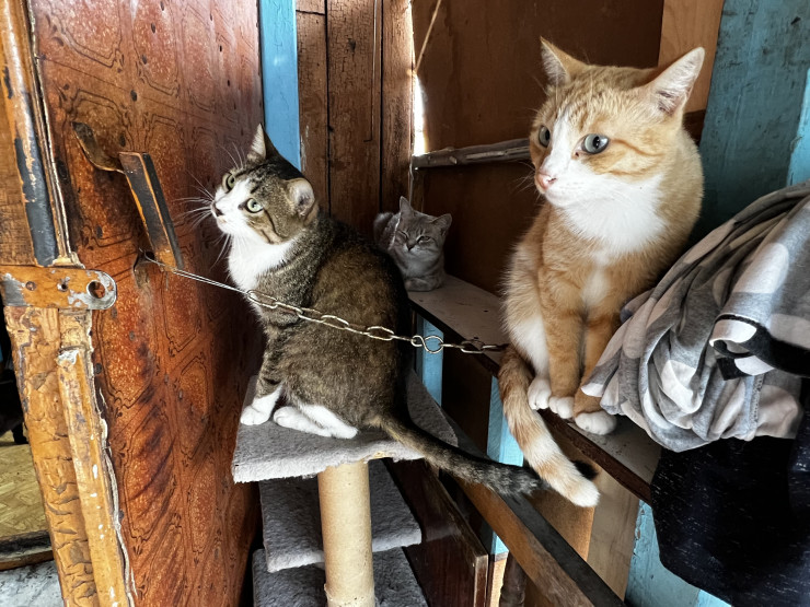 В определенных местах расставлены миски с едой и водой. На крышах и лестницах развешаны игрушки-когтеточки. В общем, настоящий кошачий рай.