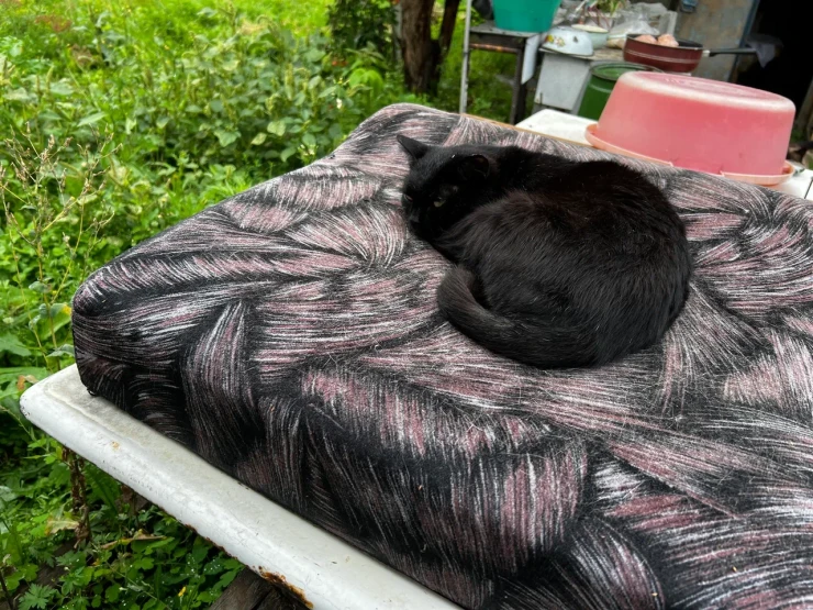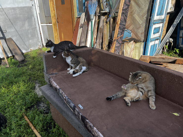 Во дворе стоят диваны, то тут, то там разложены мягкие лежанки, чтобы кошки могли отдохнуть или погреться на солнышке.