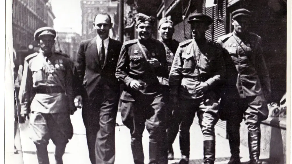 Радостные люди на следующем фото - командиры и солдаты 72-й дивизии, которые прогуливаются по улице Гибернской в Праге. Их сопровождает ответственный секретарь газеты "Право Люду". Май 1945 года.