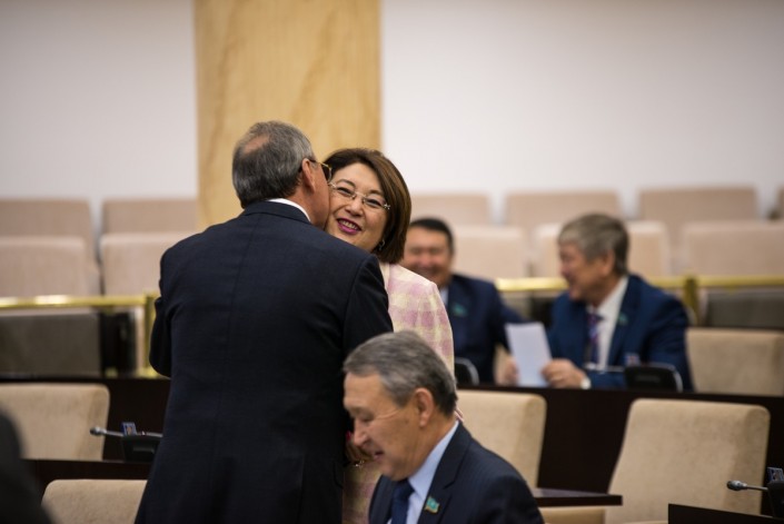 Журналистам включили трансляцию из зала. Первая, кого можно было увидеть в мониторе, - председатель Комитета по социально-культурному развитию и науке Сената Бырганым Айтимова. За пару минут до начала она подходила к коллегам и традиционно приветствовала их поцелуем в щеку. Депутат была в хорошем настроении.