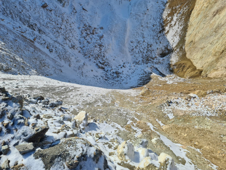 Страх затрудняет дыхание, кажется, еще немного и земля, припорошенная снегом, на стенах обвала начнет предательски сползать, и огромная воронка сомкнется над головой. Зрелище не для слабонервных. Сделав несколько фото, спешим наверх.