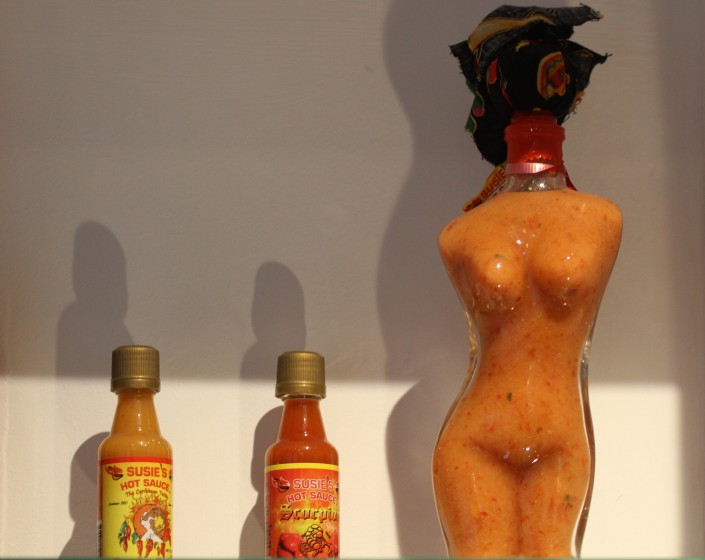 "А самый острый соус называется "Скорпион", - говорит жительница государства Антигуа и Барбуда, показывая на бутылочки, расставленные на полке в карибском павильоне.