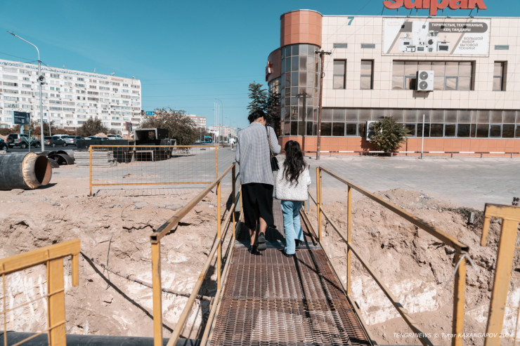 Во время прогулки с акимом города обращаем внимание на открытую траншею - без ограждений и знаков.