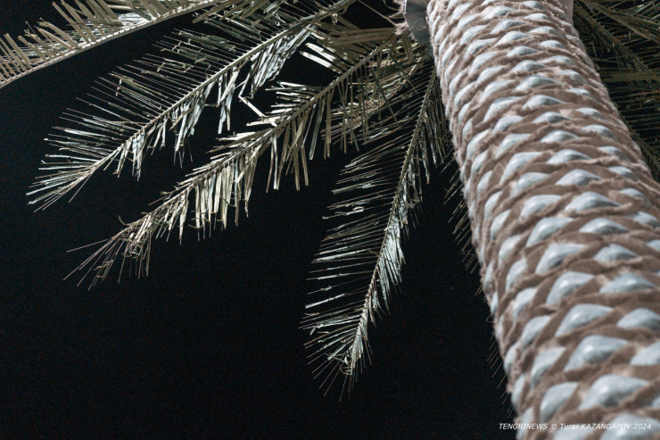 Подходим к знаменитым пластиковым пальмам. Они появились на набережной Актау в 2019 году. В прошлом году СМИ начали писать, что искусственные деревья "завяли". И сейчас декорации имеют потрепанный вид.