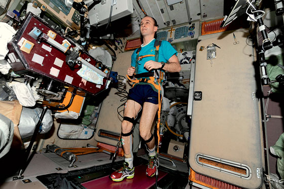 К сожалению, в условиях длительного пребывания в невесомости кости становятся менее прочными, а мышцы атрофируются, да и вообще космос не самым лучшим образом влияет на здоровье человека. По этой причине все обитатели МКС обязаны заниматься спортом каждый день. Для этого они используют различные тренажеры, в том числе беговые дорожки и велоэргометры, для чего космонавтам приходится пристегивать себя к устройствам ремнями. Также в их распоряжении находится специальное устройство, имитирующее гравитацию, которое позволяет выполнять различные земные упражнения, например приседать.