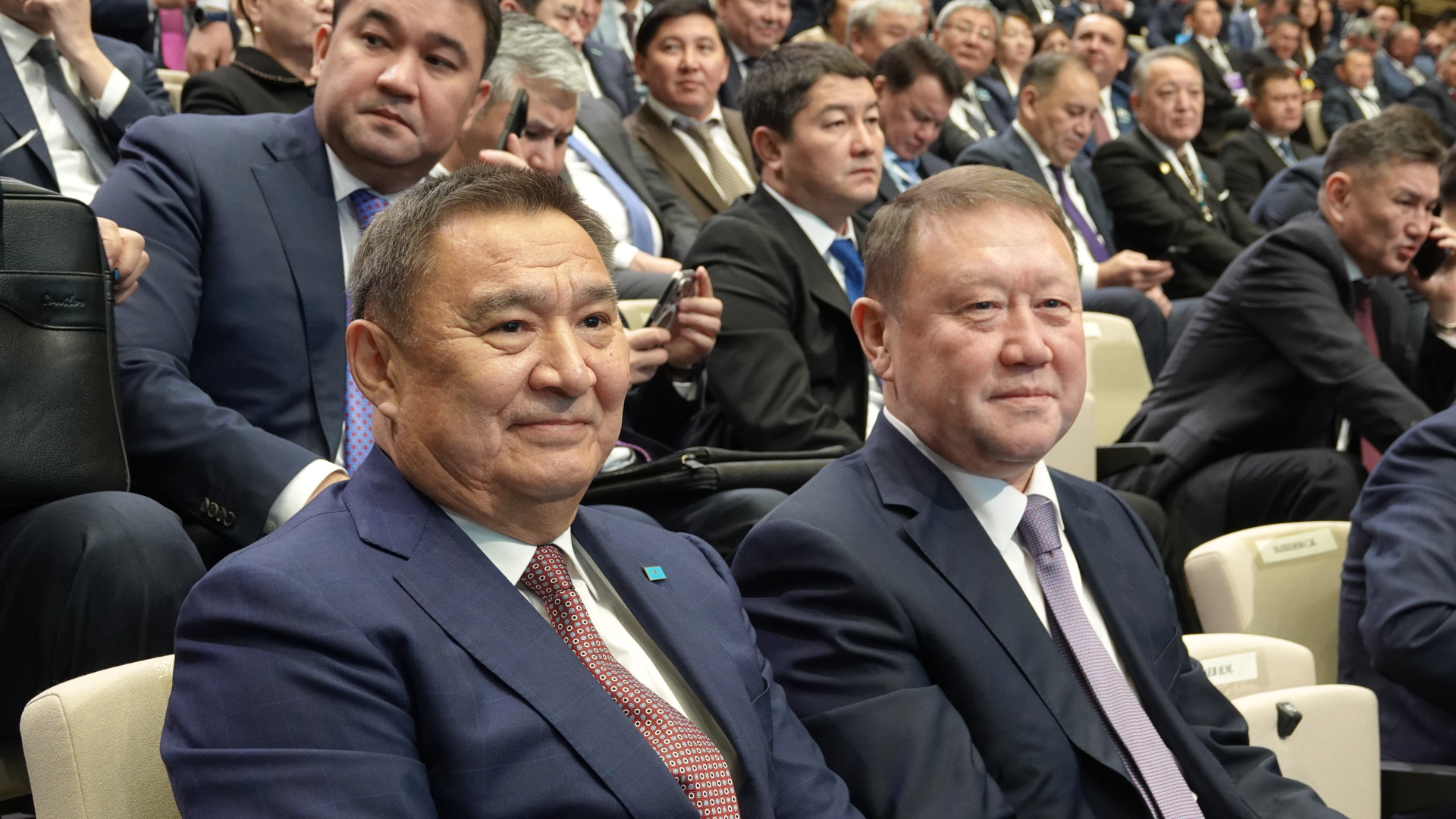Рядом сидят акимы-соседи — Марат Ахметжанов (Акмолинская область) и Кумар Аксакалов (Костанайская область).