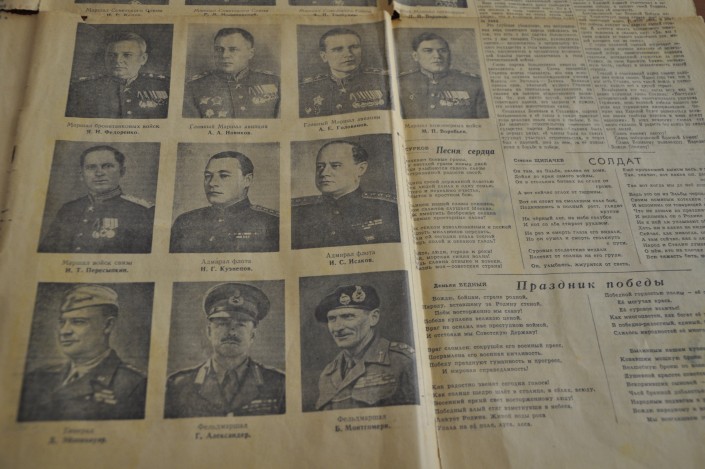 На первой странице - огромный, во весь рост, живописный портрет Иосифа Сталина, а также фотографии премьер-министра Великобритании Уинстона Черчилля, президента США Гарри Трумэна и групповой снимок Сталина, Рузвельта и Черчилля в дни Тегеранской конференции. Лидеры стран-союзников поздравляют с Великой Победой. Здесь же - акт о безоговорочной капитуляции немецких войск. А самое главное - это обращение вождя к своему народу.