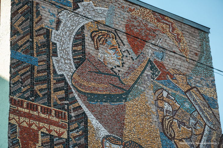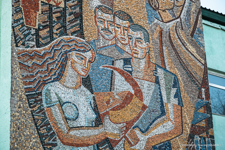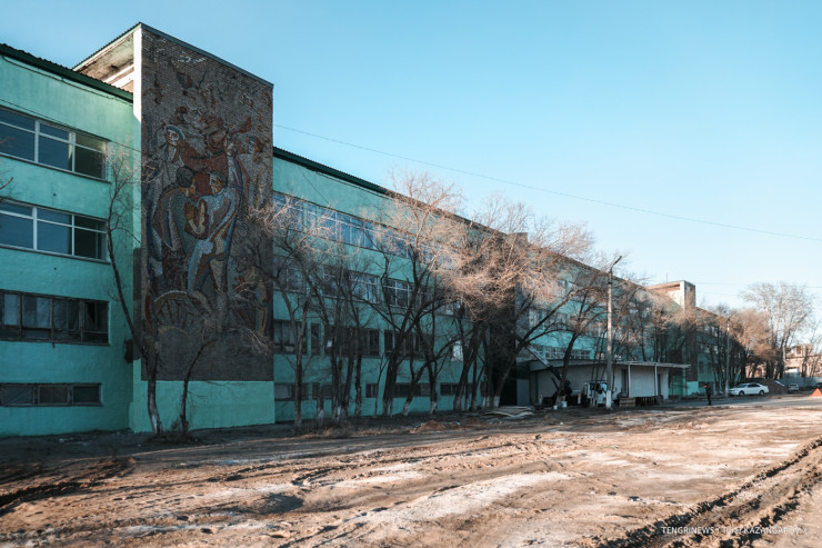 До следующего объекта нам пришлось немало проехать на автомобиле в промышленный район города. Сейчас здесь частное общежитие, но раньше это был административный корпус знаменитого завода "Казахсельмаш" с главной проходной. На нем пока еще сохранились два мозаичных панно: "Труд" и "Октябрь". Монументальная композиция из смальты выполнена художником Василием Товтиным.