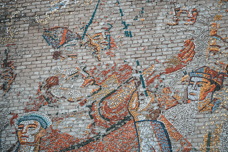 "На второй мозаике отражена тема труда: детали сельхозмашин, рабочие и крестьяне. Завод "Казахсельмаш" был основан в 1969 году на базе цеха завода "Целиноградсельмаш" как часть этого производственного объединения – крупнейшего в СССР предприятия сельскохозяйственного машиностроения. Завод выпускал сеялки, культиваторы, запчасти к сельхозмашинам, товары садово-огородного и спортивного назначения и так далее", - рассказал исследователь.