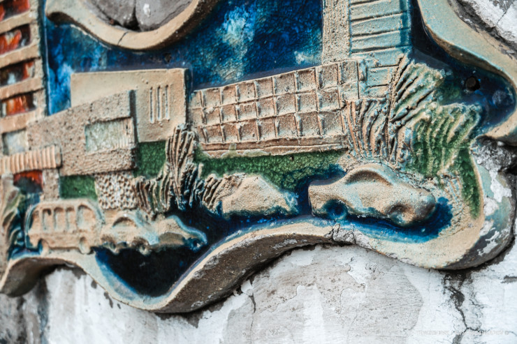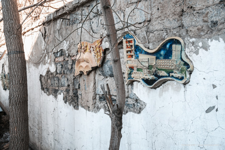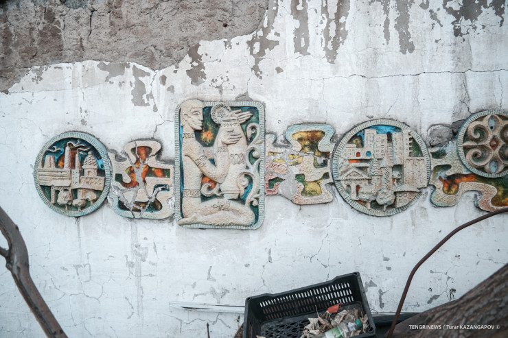 "С одной стороны изображен парень, с другой – девушка. Композиция города, отсылки к целиноградскому периоду, цветы, орнаменты, колоски пшеницы, заводы и так далее. Лицо девушки посредине, к сожалению, разрушилось. Эта работа, шамот с глазурью, предположительно, выполнена целиноградским художником Элдаром Бордзикашвили. Однако достоверно неизвестно, чья это работа. Ни в каких каталогах ее нет", - рассказывает Темиртас Искаков.