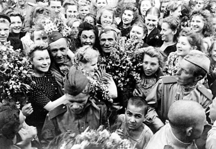 Наверное, только в мае сорок пятого люди, говорившие на разных языках, вместе отмечали общую победу, пели, танцевали, плакали и обнимались с незнакомцами на улицах. Потом народы разошлись по разные стороны железного занавеса, и принялись переругиваться через забор: "Это наша победа, а не ваша".