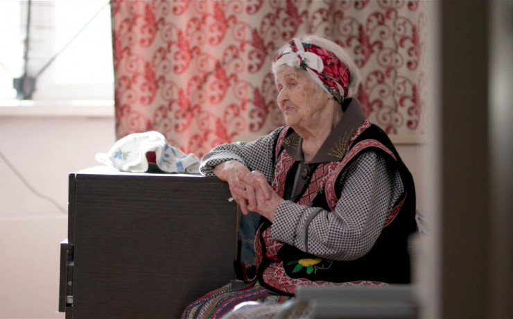 Баба Паша надевает награды, среди которых медаль "Непокоренные", и запевает любимые старые песни.