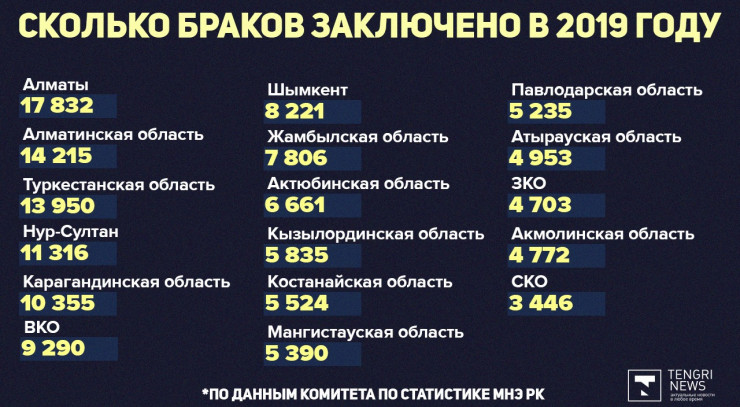 По данным Комитета по статистике МНЭ РК, в 2019 году в Казахстане было зарегистрировано 139 504 брака. Лидирует Алматы: