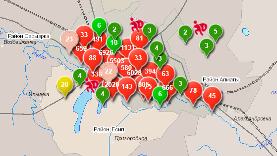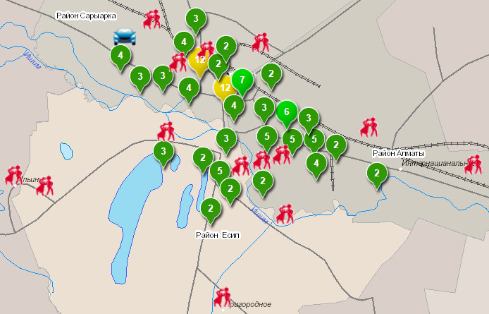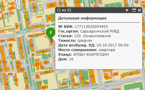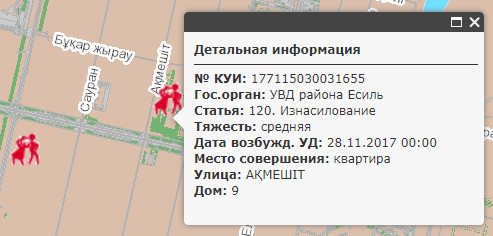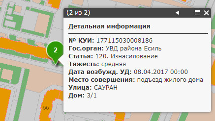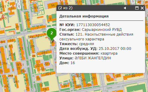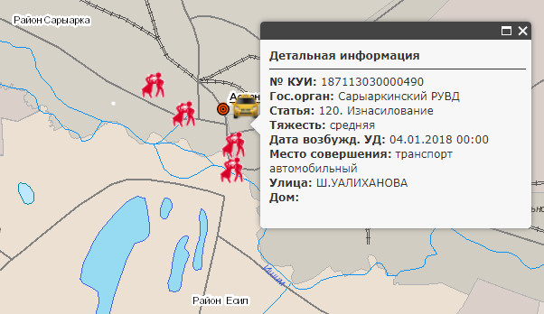 Вообще, если взглянуть на всю Карту уголовных правонарушений, то можно увидеть, что случаи сексуального насилия происходят по всей Астане, включая и пригородные поселки.