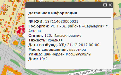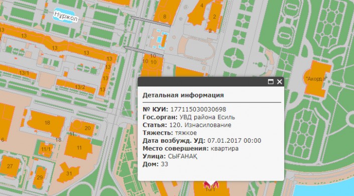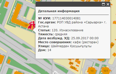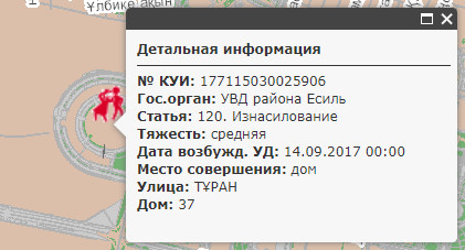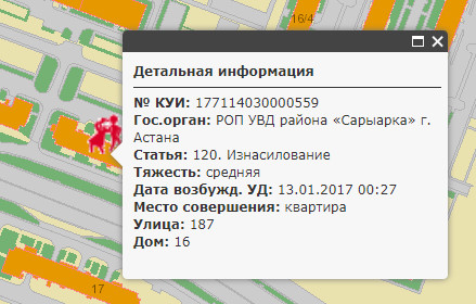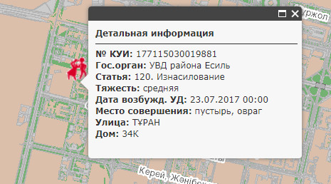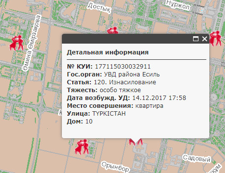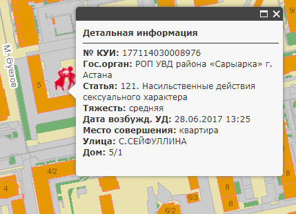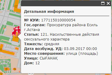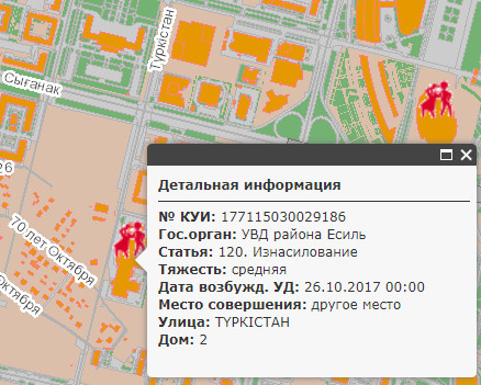 Примечательно и то, что иконка, которой на Карте преступности изображается изнасилование, расположена как бы на здании концертного зала "Казахстан". Произошедшее здесь преступление было отнесено к разряду тяжких.