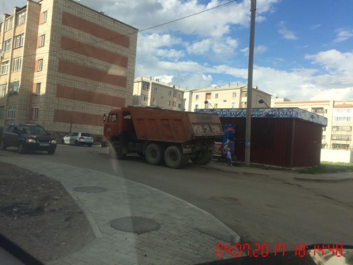 Припаркованный на тротуаре КамАЗ в микрорайоне "Центральный", возле детского сада "Арман", заснял очевидец.