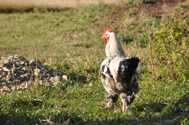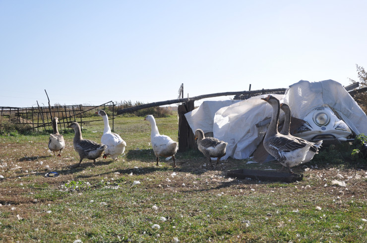 Возле дома стоят стога сена и техника, лежит гора дров. Рядом важно ходят гуси, копаются куры. Петух, увидев нас, закукарекал.