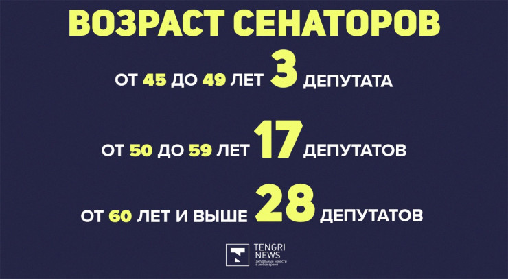 Самыми возрастными сенаторами стали Бекмырза Еламанов и Тулеубек Мукашев 1950 года рождения. Бекмырзе Еламанову 70 лет исполнилось 1 января, а Тулеубек Мукашев семидесятилетие будет отмечать 25 апреля.