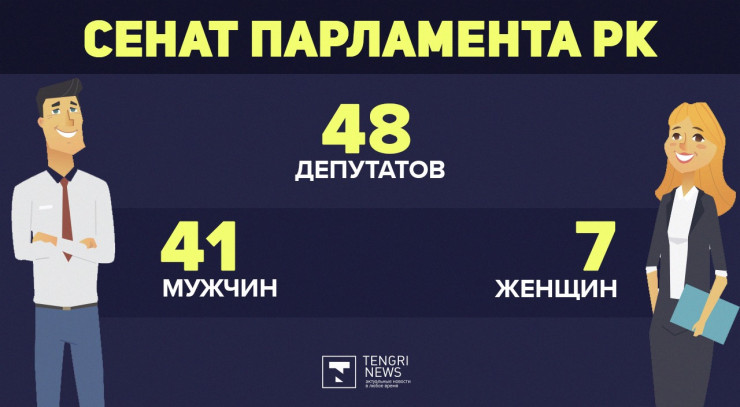 Высшую палату - Сенат - образуют 34 депутата, по двое от каждой области и городов республиканского значения. 15 депутатов назначаются в Сенат Президентом Казахстана. По данным пресс-службы Сената, на сегодняшний момент в высшей палате 48 депутатов. Срок их полномочий - шесть лет.