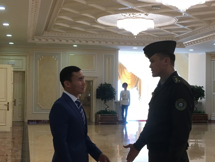 В тот момент, когда почти все приглашенные на встречу с Президентом для вручения наград уже покинули Акорду, в фойе президентского дворца все еще находился писатель Анес Сарай, который в этот день получил от Назарбаева орден "Барыс" III степени. Казалось, что он никуда не торопится.