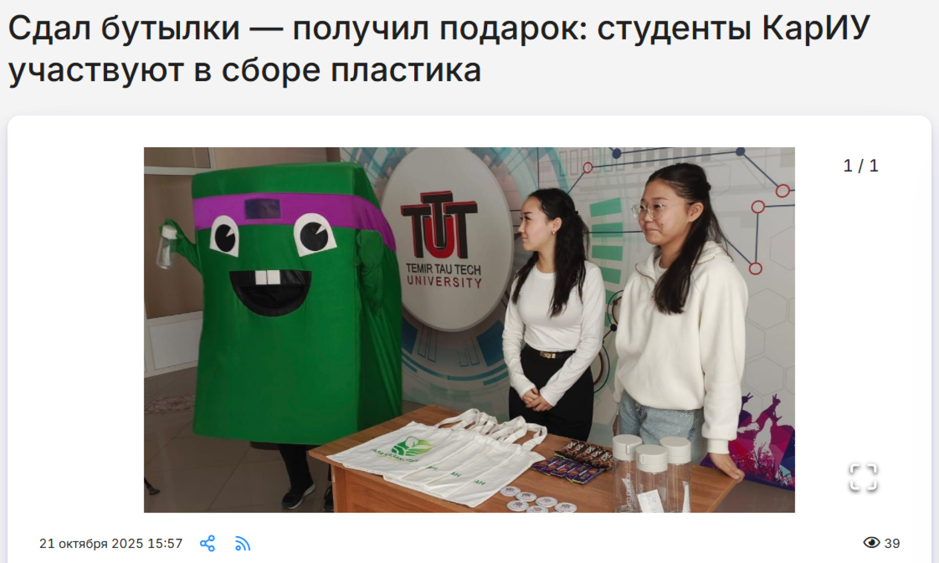 В Карагандинском индустриальном университете прошла экологическая акция. Студенты приняли участие в сборе и сдаче пластиковых бутылок на переработку. Для них подготовили призы: за пять бутылок студенты получали шоколадки и значки, а за двенадцать и более — термосы, экосумки и прочие полезные в хозяйстве предметы.