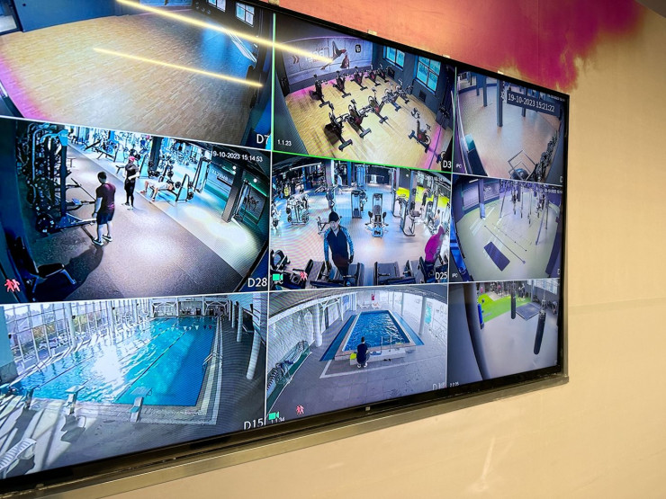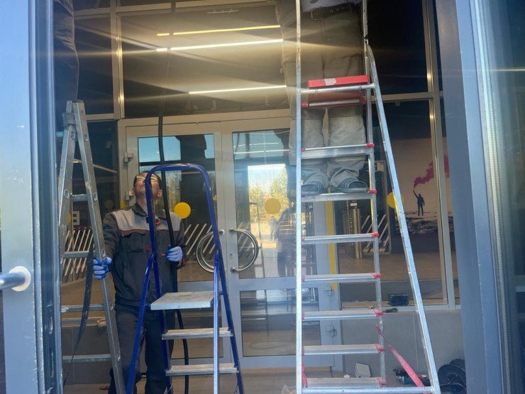 При входе в фитнес-центр можно увидеть работников, занимающихся ремонтом для подключения тепла в помещении при входе в здание. Справа от входа находится ресепшен, где сотрудники фитнес-клуба консультируют людей по покупке абонемента в зал.