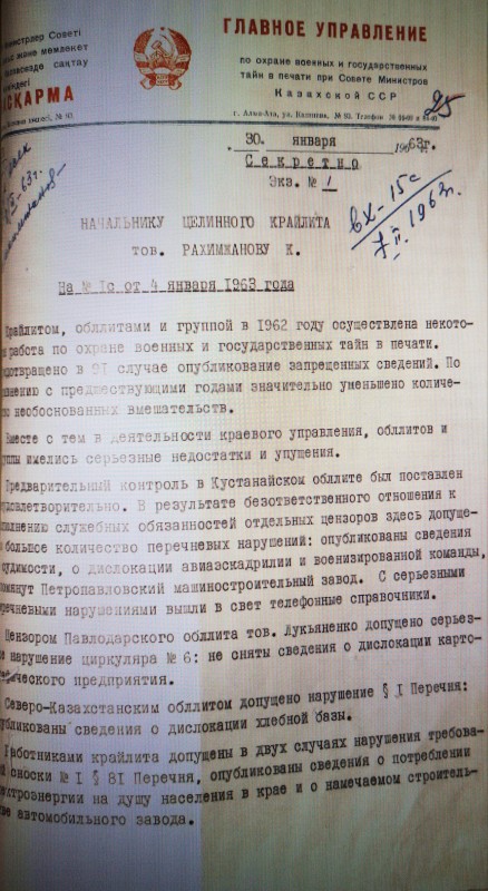 В таком же отчете, но за 1961 год казахстанские цензоры нашли информацию о Петропавловском машиностроительном заводе, что тоже было нарушением.