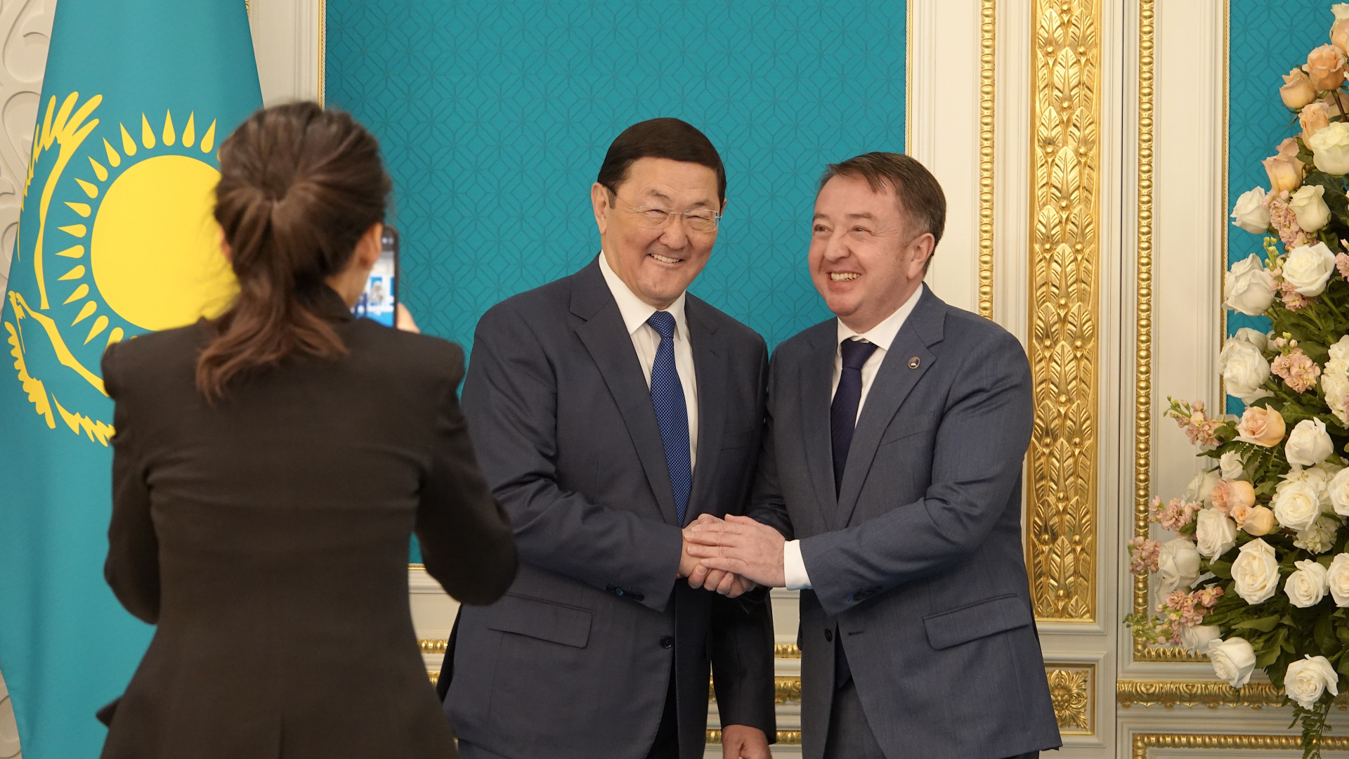 В зал входят Асылов и Сарсембаев. Руки встречаются в крепком рукопожатии, а улыбки — широкие, синхронные, как будто репетировали.