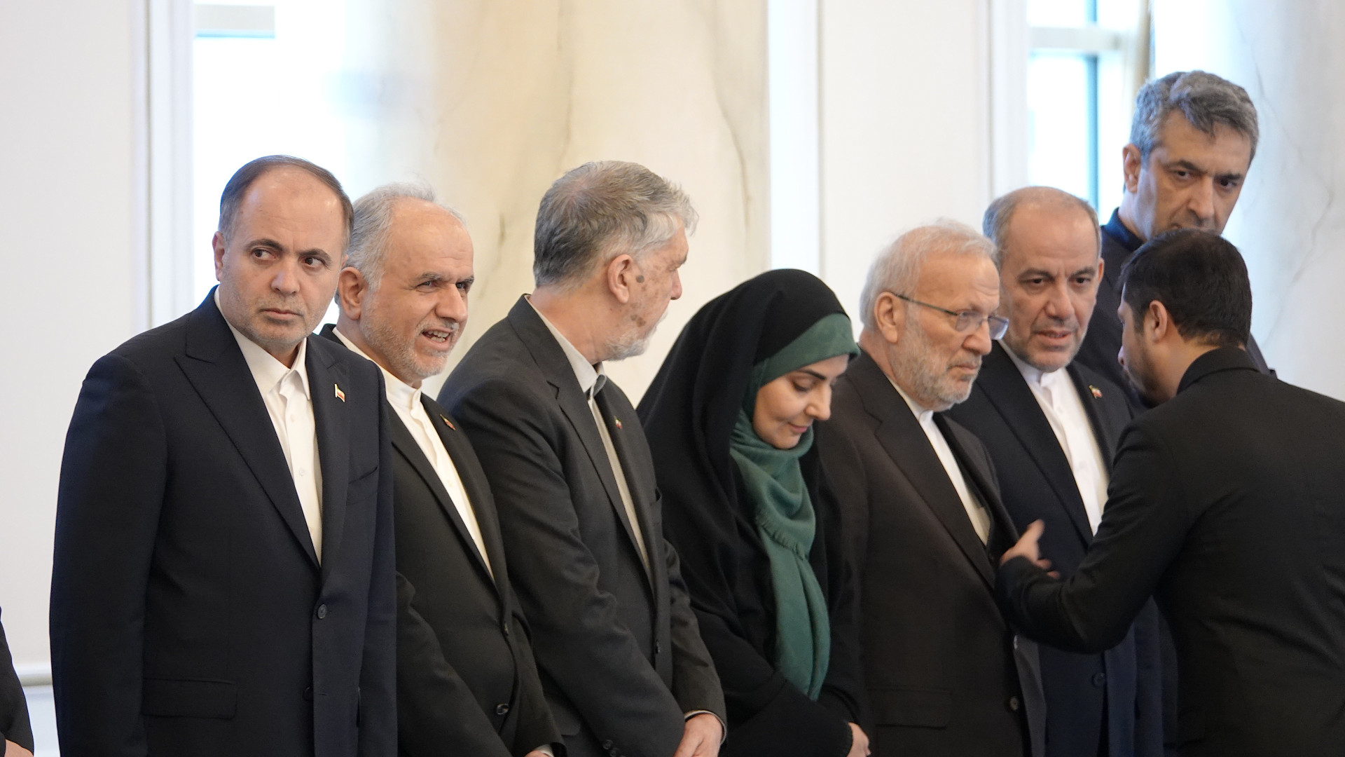 Иранская делегация выглядит так, будто действительно готова вести разговор "без галстуков" — не в переносном, а в самом прямом смысле. Этот аксессуар в Тегеране давно не в моде: слишком "западный". Поэтому официальные костюмы обходятся без него уже многие десятилетия.