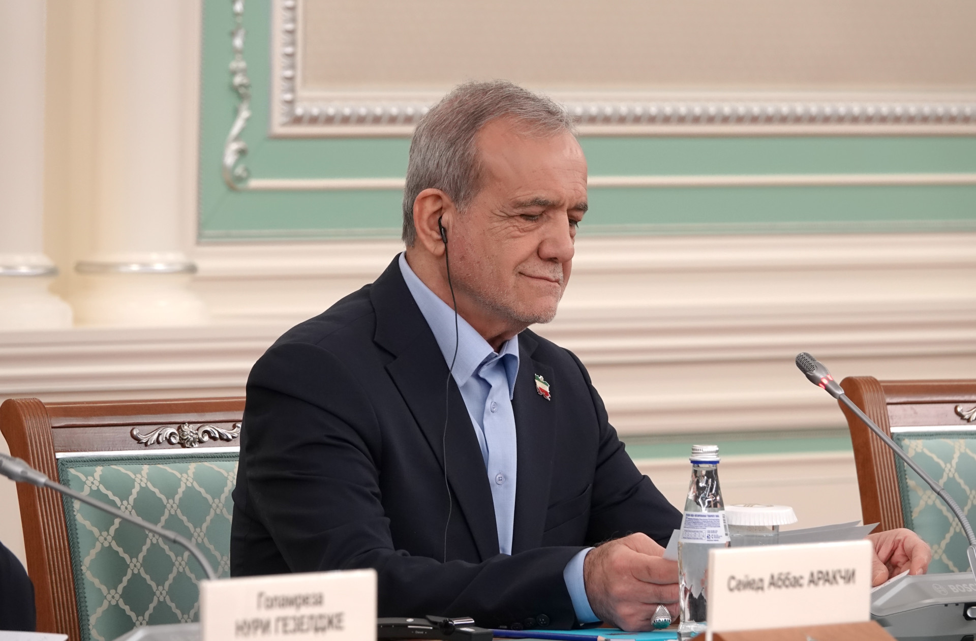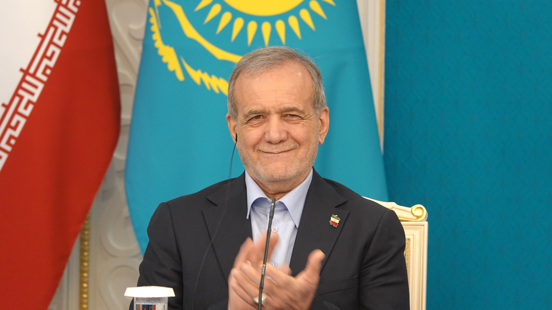 Пезешкиан возвращается в зал в хорошем расположении духа. После подписания восьми документов его эмоции только усиливаются — аплодирует так, что сомнений не остаётся: момент ему действительно нравится.