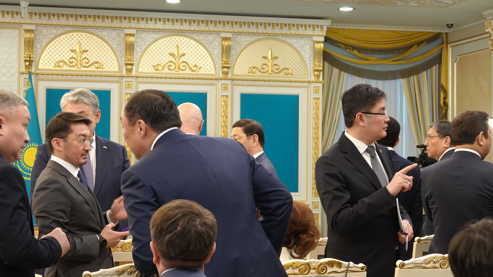 Разговор обрывается. Министры и советники заходят в зал и сразу поднимают температуру: вокруг — обрывки диалогов, быстрые движения рук, короткие указания пальцами.
