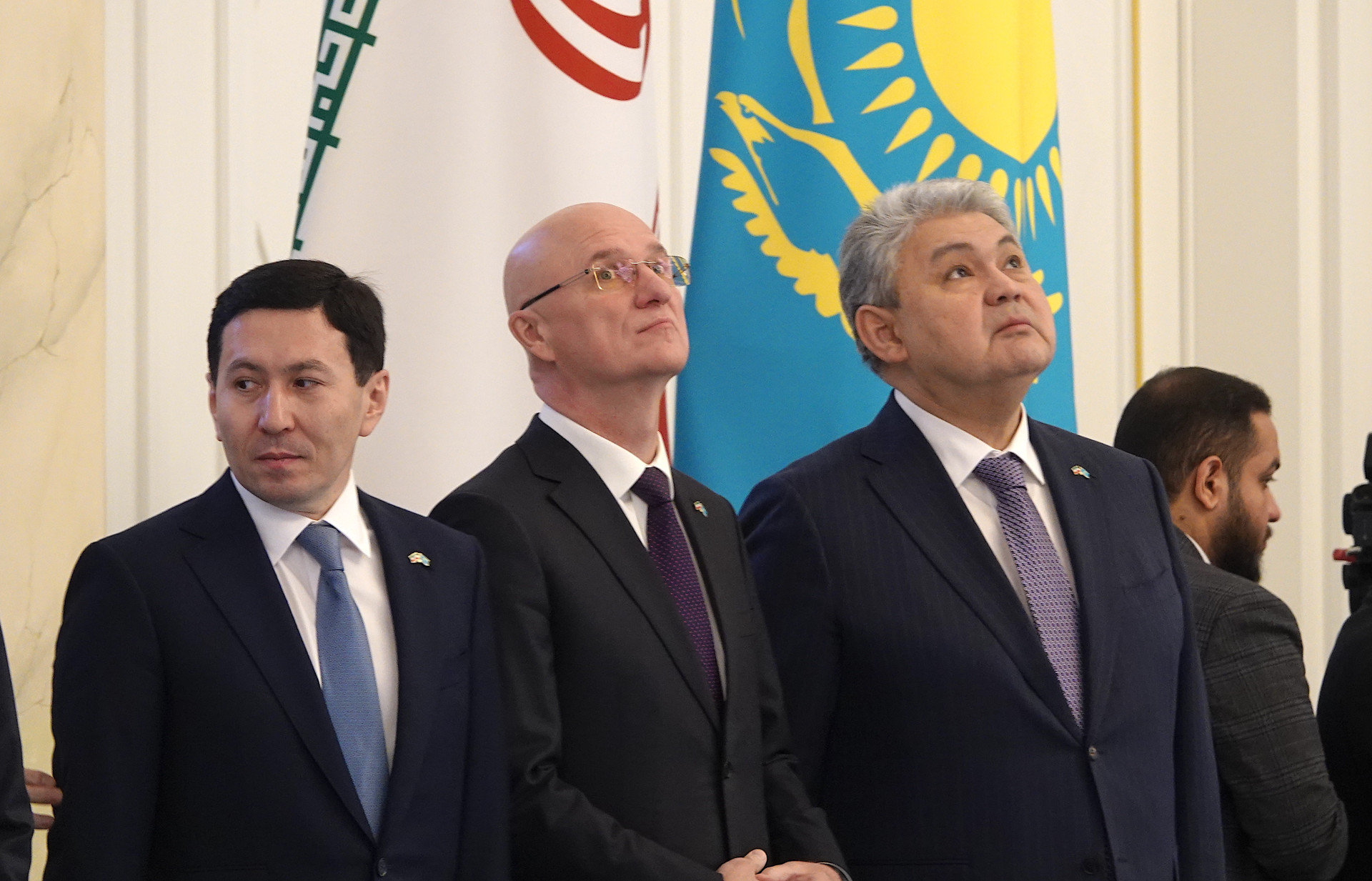 В отсутствие галстуков у иранских чиновников есть другая обязательная деталь: на лацканах аккуратно блестят маленькие значки с флагом их страны. У казахстанской делегации свои версии значков, но уже с двумя флагами.