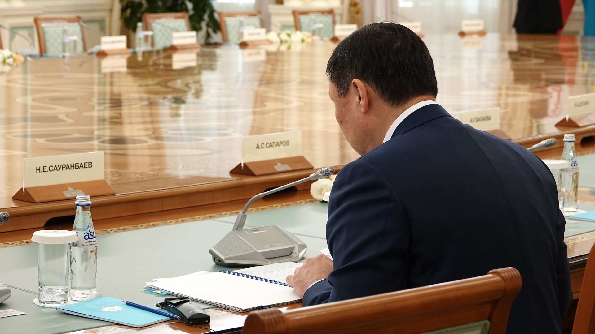 Пока я медленно разглядывал кольца иранцев, на другом конце стола одиноко сидел министр транспорта Казахстана Нурлан Сауранбаев. Не отвлекался, не смотрел по сторонам — просто читал и делал заметки.