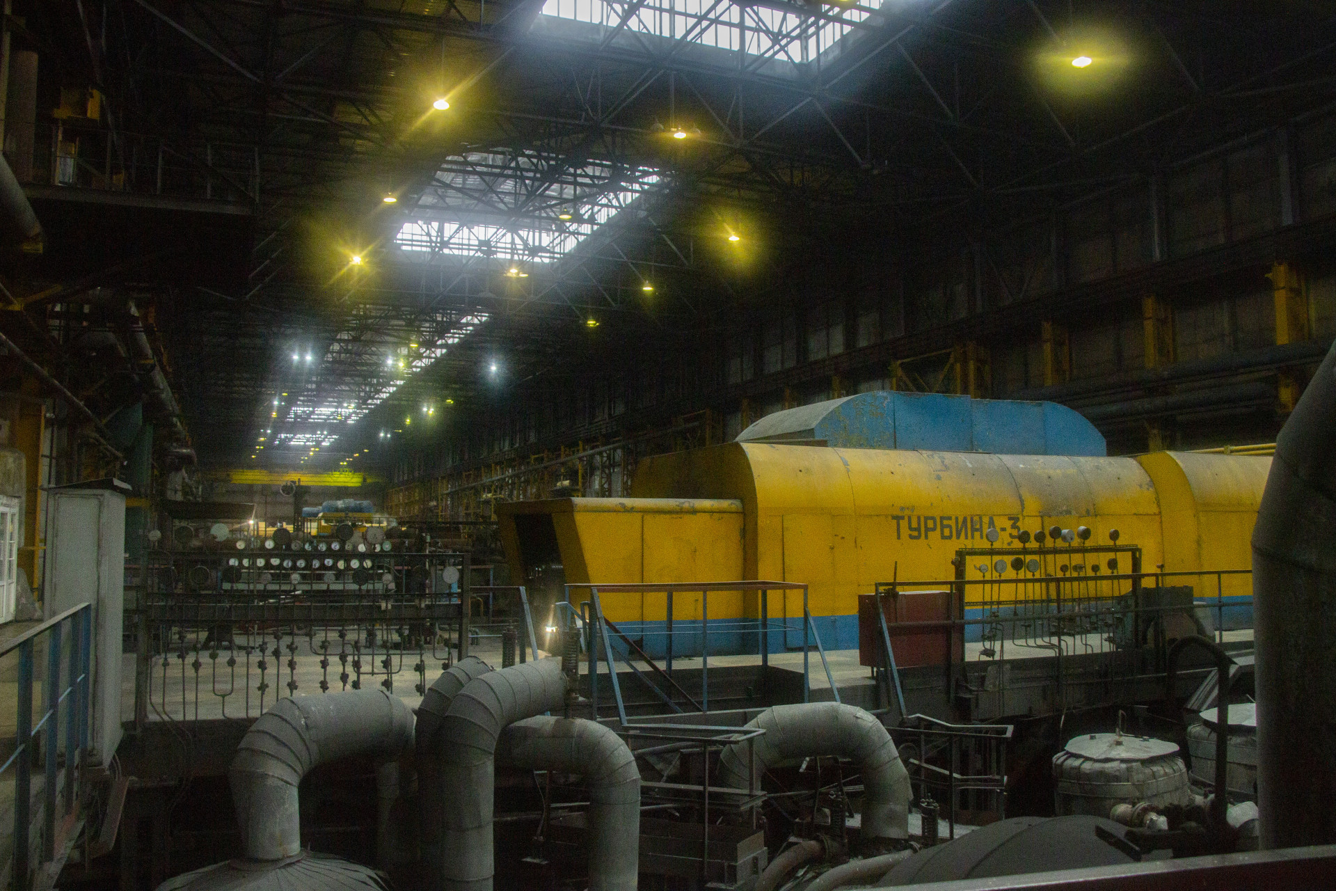 Дальше мы заходим в главный блок. Здесь расположены котлы, турбины и генераторы, а также системы, которые их контролируют. Котлов на этой станции восемь, а турбин — шесть.