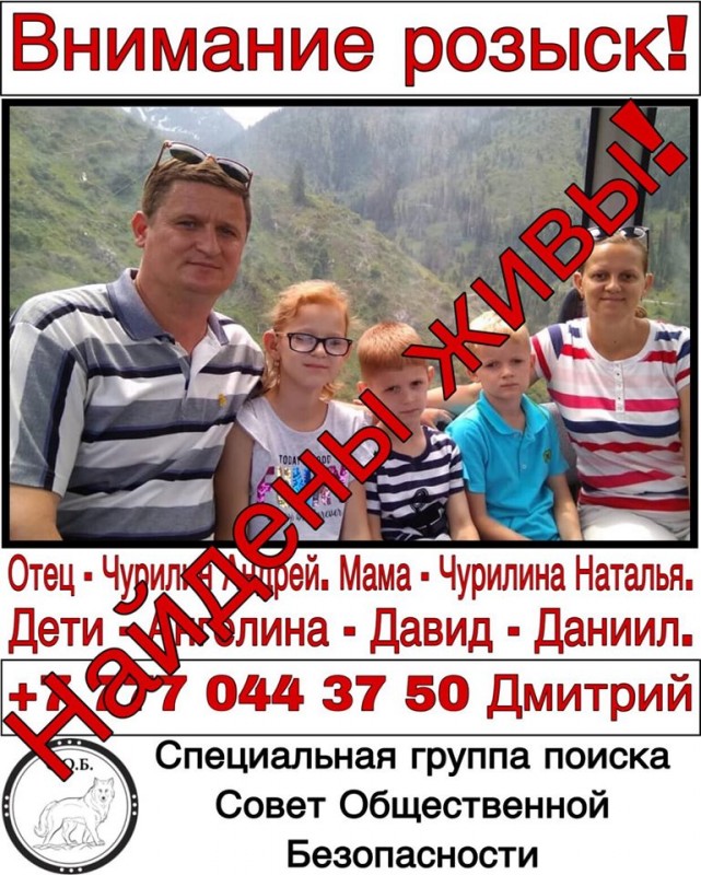 Пост из группы СОБ. Инициативный проект сообщает о результатах поиска повторным размещением ориентировки с пометкой "Найден. Жив" Или "Найден. Мертв". На этой ориентировке - семья Чурилиных, известие о пропаже которых появилось 9 августа. В тот же день стало известно, что они были на отдыхе на озере Кольсай.
