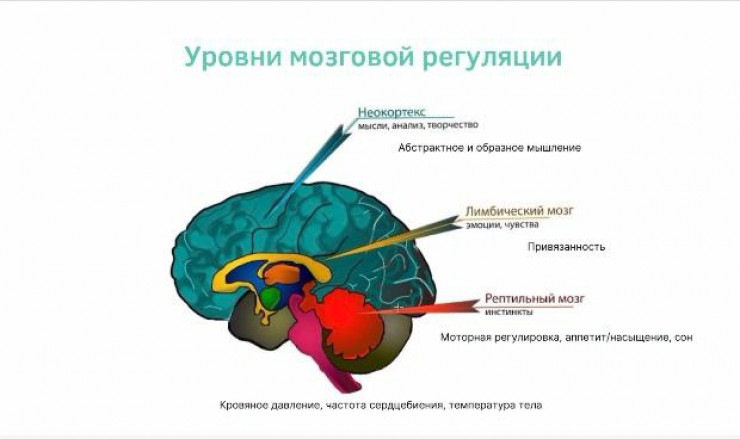 Наша нервная система, как известно, управляется мозгом. А в мозге, если так глобально упростить, три отдела. Самый нижний отдел называется рептильный мозг. Он отвечает за инстинкты: глотание, пища, сон, секс. Вот такие вещи глубоко в рептильном мозге. И он командует ими.
