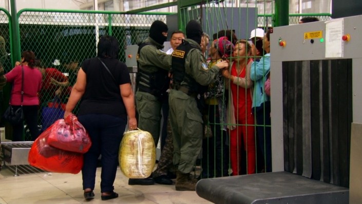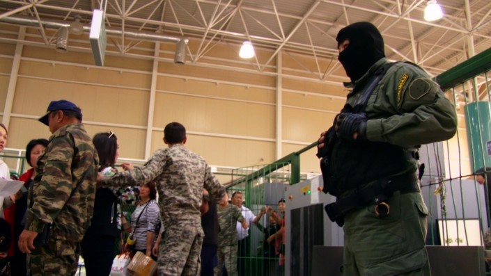 С недавних пор в зале въезда на территорию Казахстана из МЦПС "Хоргос" появились спецназовцы. Люди в черных масках пришли на подмогу работникам таможни, ведущим противостояние с так называемыми "несунами".