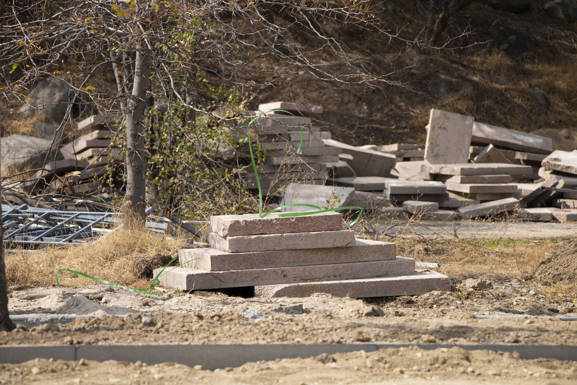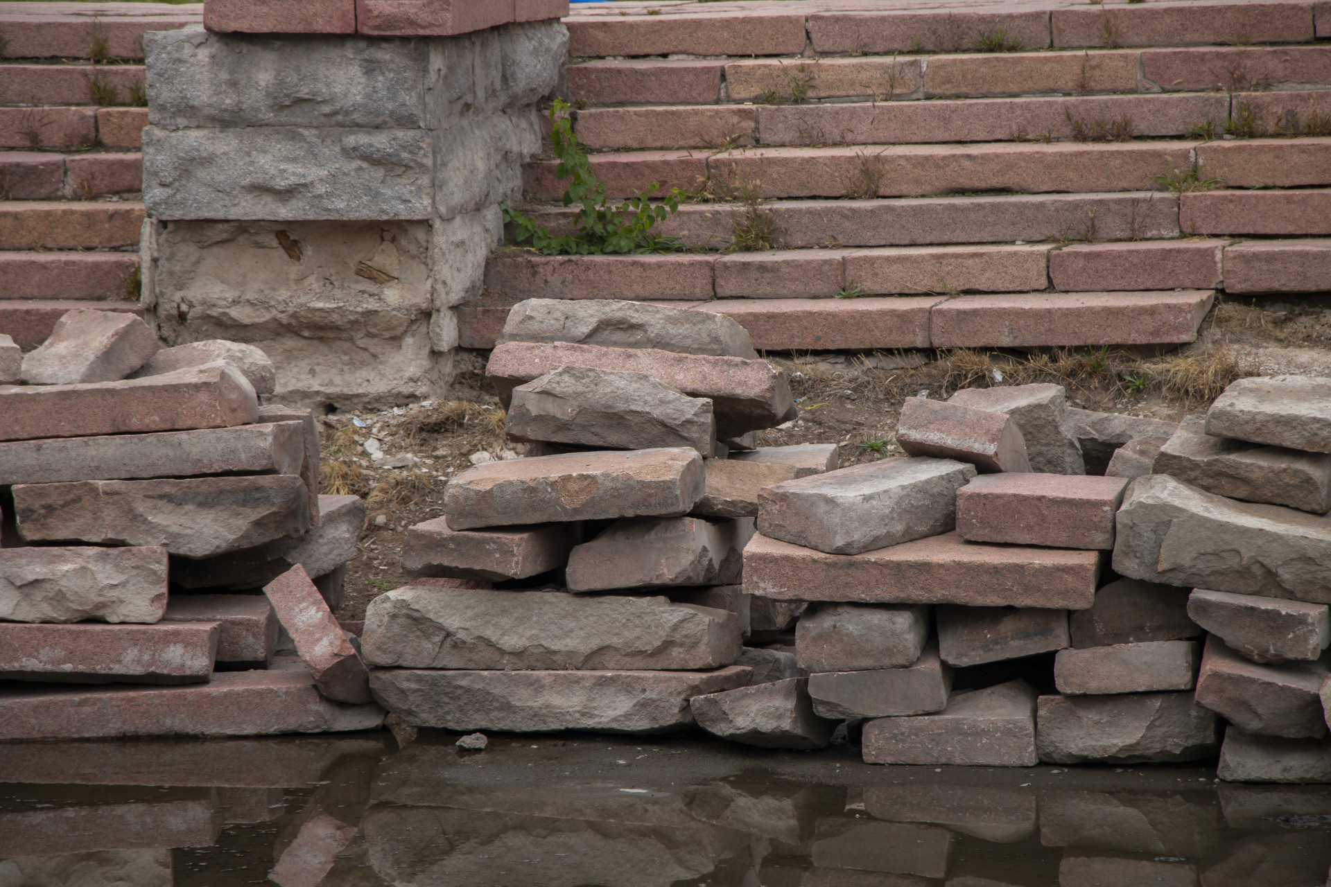 На месте были и те самые гранитные плиты. Как отмечал корреспондент Tengrinews.kz, они разбросаны чуть поодаль от русла. Некоторые из них были повреждены. А взамен снятого гранита на бетонные каскады нанесли гидроизоляционную краску AquaFix.