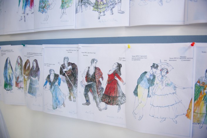 "Здесь показан очень резкий переход от лета к зиме, поэтому и темных цветов здесь достаточно. А вот в сцене на табачной фабрике женщины оголены, они показаны художником по костюмам в корсетах и рубашках, для них мы использовали пастельные тона. Все картины отличаются палитрой, здесь нет преобладающего цвета, она всегда разная", - разъяснила ассистент художника по костюмам Арасель Досмуратова.