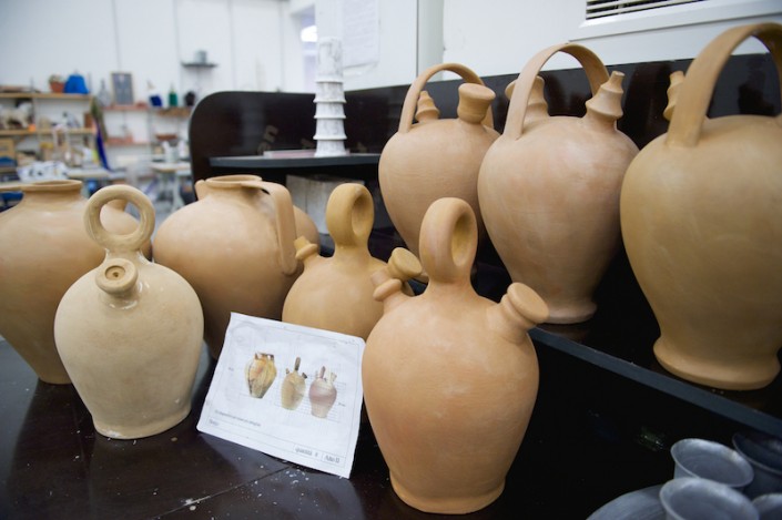 "Необычной формы посуда, кувшины, вазы удивили нас сразу, как только мы увидели эскизы. Изготовлялись они по технологии папье-маше, но вначале отливались формы, вытягивались глиной, затем  заливались гипсом, а уже потом лепилось папье-маше, - рассказывает художник-бутафор, скульптор Даурен Омаров. - Бутафорские ружья по технологии изготовления идентичны настоящим: дерево, металл и чеканка, а если добавить специальный механизм, то они смогут даже стрелять. Светильники выполнены из дерева, но так задекорированы, что выглядят, как будто сделаны из старой латуни, с проступившей на железных вставках ржавчиной".