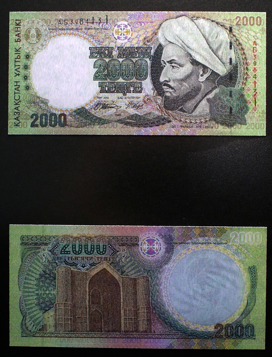 Со временем возникала потребность в более высоких номиналах тенге, в том числе из-за инфляции. Первые банкноты высоких номиналов сформировали серию "Аль-Фараби", основным изображением на которых был портрет великого ученого и просветителя Востока. Банкноты этой серии выпускались в 1994 году номиналом 200, 500 и 1000 тенге, в 1996 году появилась банкнота в 2000 тенге, в 2000 году - в 5000 тенге и в 2003 году - в 10 000 тенге. Периодически в банкноты этой серии вносились изменения для того, чтобы усилить и усовершенствовать защитные свойства, не меняя основное изображение.