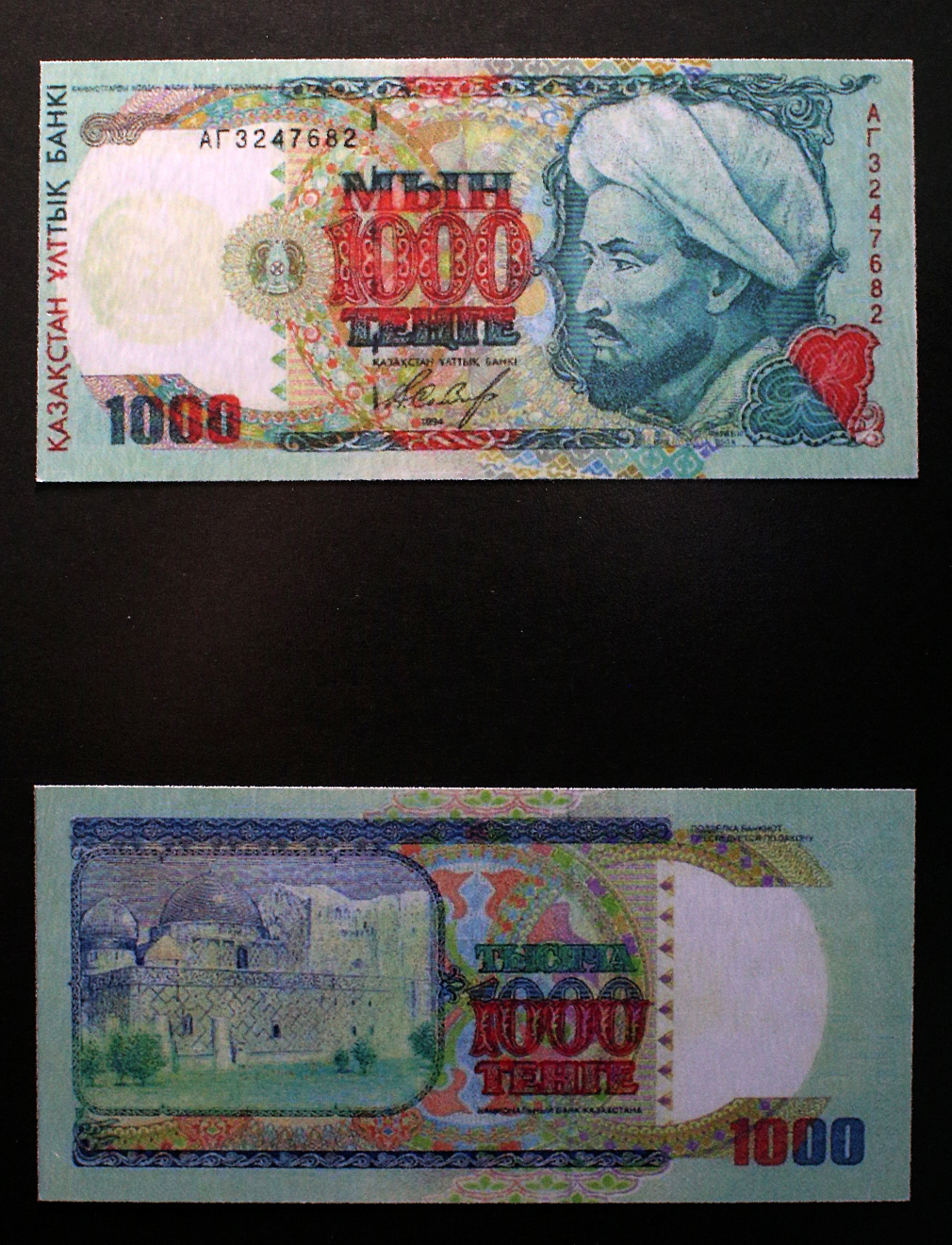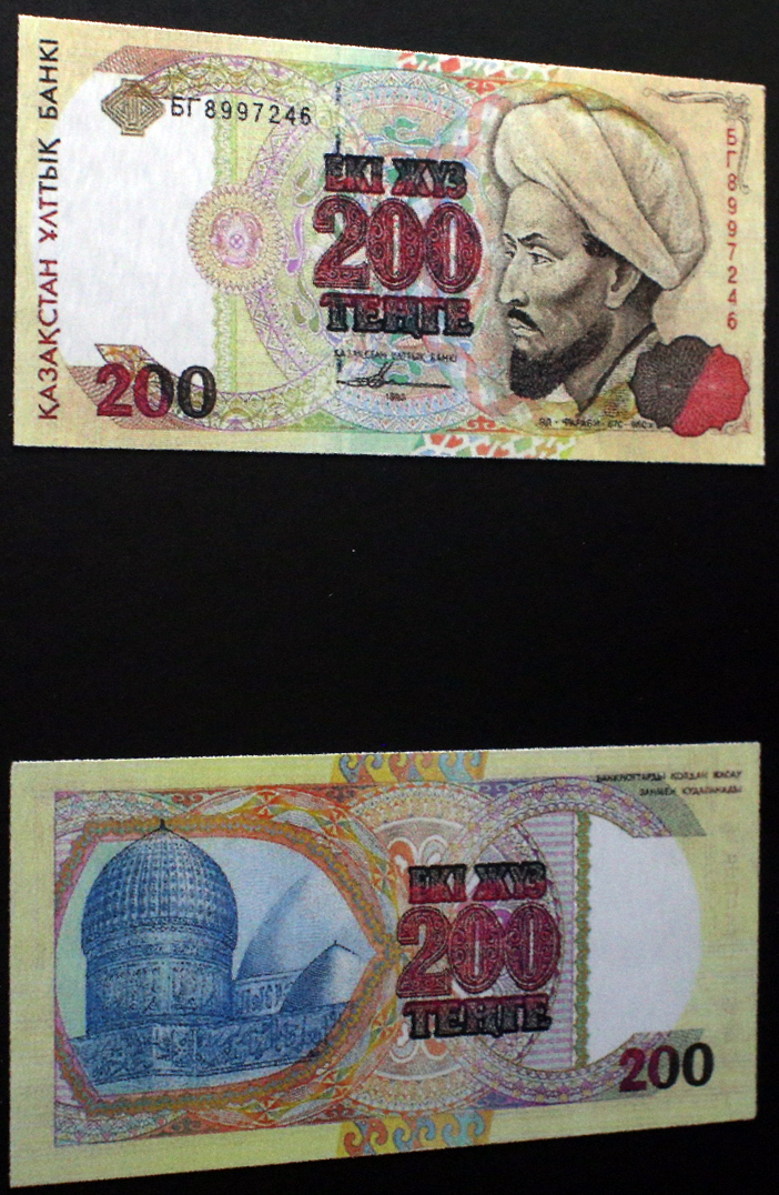 Со временем возникала потребность в более высоких номиналах тенге, в том числе из-за инфляции. Первые банкноты высоких номиналов сформировали серию "Аль-Фараби", основным изображением на которых был портрет великого ученого и просветителя Востока. Банкноты этой серии выпускались в 1994 году номиналом 200, 500 и 1000 тенге, в 1996 году появилась банкнота в 2000 тенге, в 2000 году - в 5000 тенге и в 2003 году - в 10 000 тенге. Периодически в банкноты этой серии вносились изменения для того, чтобы усилить и усовершенствовать защитные свойства, не меняя основное изображение.