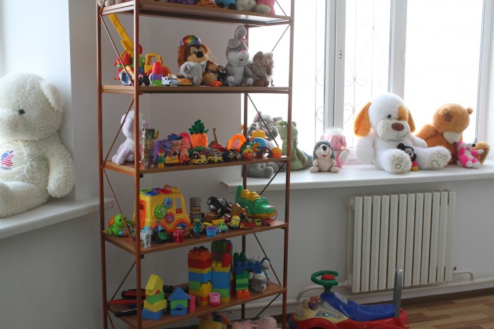 Делегация во главе с Еленой Тарасенко входит в яркую комнату, похожую на ту, которые бывают в детсадах. Там много детишек. Они здесь, пока родители на работе.