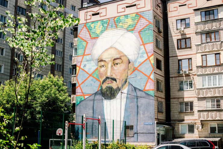 Вот еще один интересный мурал. Изображен на доме в районе улиц Абая-Момышулы.