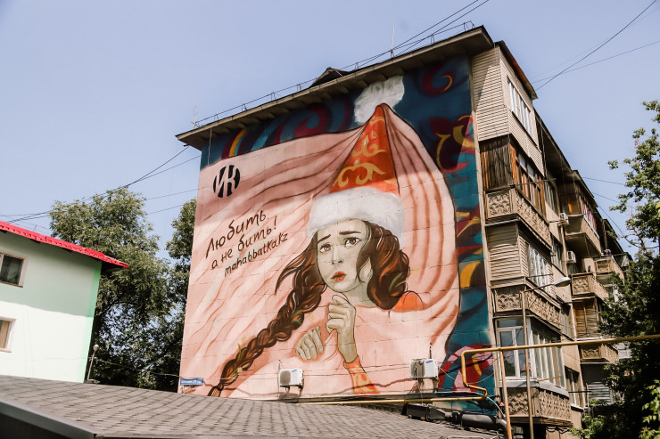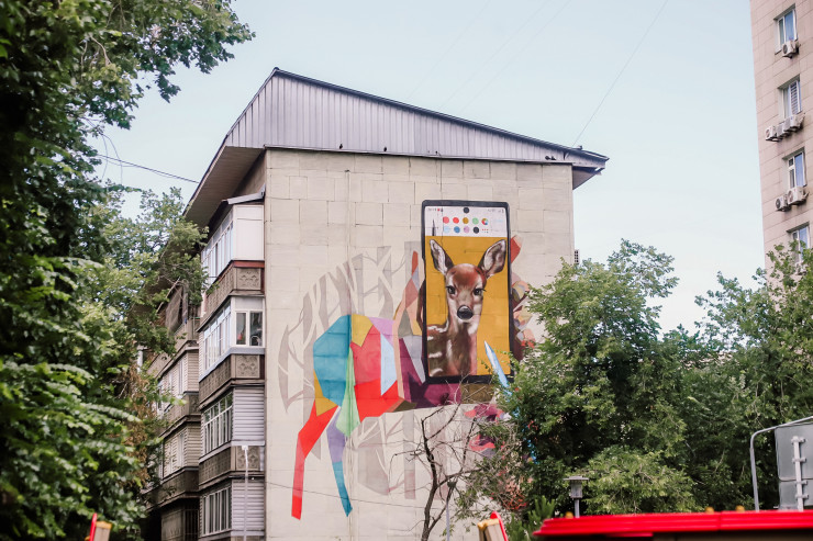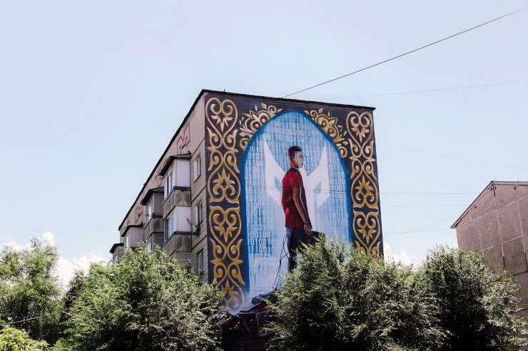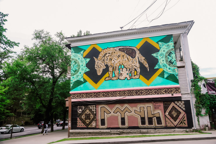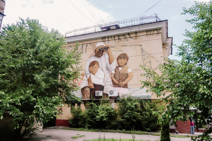 Вот еще один интересный мурал. Изображен на доме в районе улиц Абая-Момышулы.