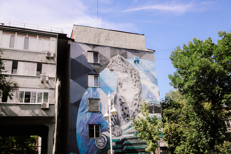 Снежный барс, горы - символы Алматы. В создании мурала приняли участие ребята из арт-студии "Неоновый Шаман". Как отмечалось, молодые художники предпочитают работать в технике реализма, отдавая предпочтение четким и важным мелким деталям.