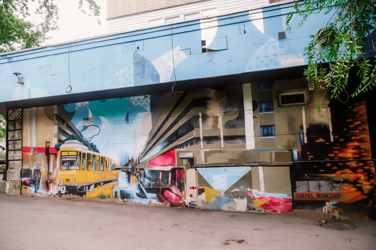 Когда-то по улице Шевченко проходил трамвайный маршрут номер 4. Художники из команды Repas решили увековечить его на перекрестке Шевченко — Тулебаева.