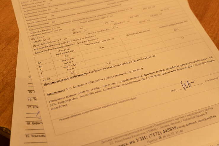 "Вот представьте сердце, по бокам у него два клапана работают. Это если в норме. А у Тамирис один клапан расположен не сбоку, а внизу. В результате это дает сбой, что-то у нее там сжимается, перекрывает, может, воздуха не хватает, появляется одышка, она начинает синеть, идет паническая атака. Операция заключается в том, чтобы клапан переместить из нижней части на бок, тогда будет норма", - говорит Тогжан.